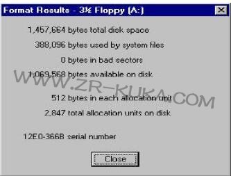 完成前,窗口顯示格式化結果的總結,也可能顯示出現的錯誤。如果此處列出錯誤,用另外軟盤替換這張軟盤。