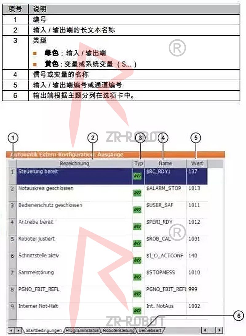 該輸出端由機(jī)器人控制系統(tǒng)來設(shè)定,以向上級(jí)控制器顯示出現(xiàn)了一條要求停住機(jī)器人的信息提示。(例如:緊急停止按鍵、運(yùn)行開通或操作人員防護(hù)裝置)